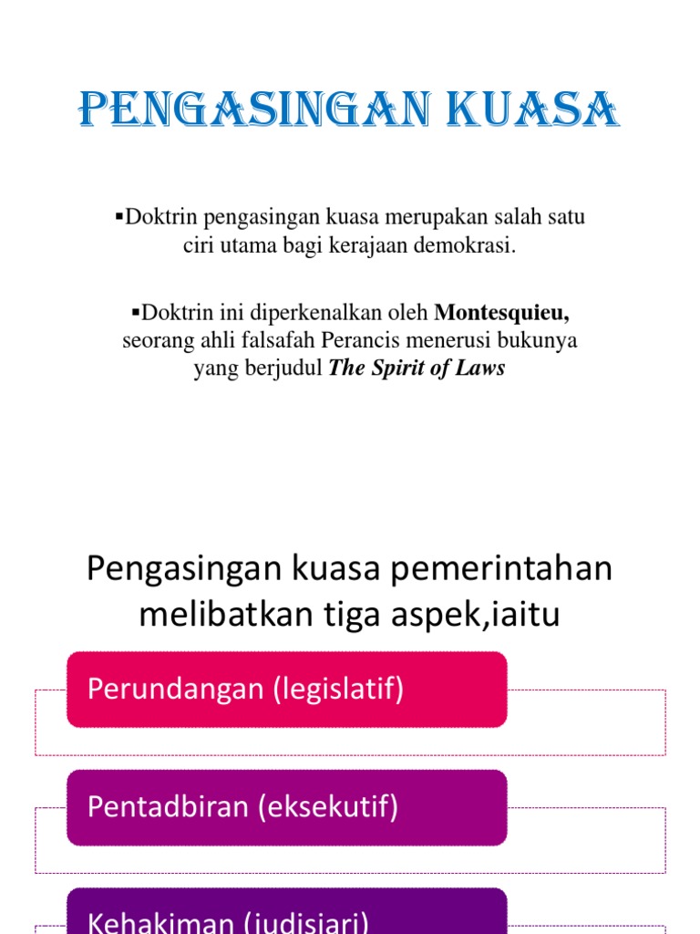 DOKTRIN PENGASINGAN KUASA DI MALAYSIA PDF. Doktrin Pengasingan kuasa secara dasar bererti. View Pengasingan-Kuasapdf from AA 1Fungsi Tiga Cabang Kuasa Negara Legislatif Eksekutif Kehakiman.