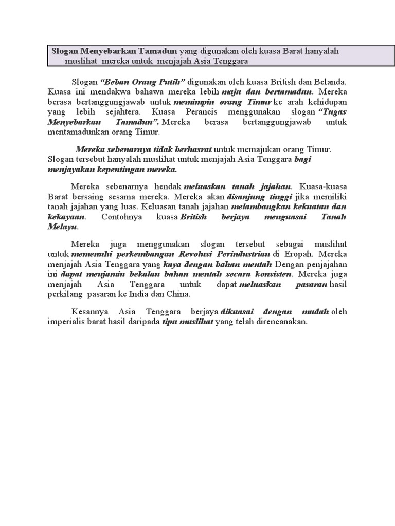 Menggunakan slogan beban orang putihuntuk menyatakan bahawa mereka lebih maju dan bertamadun. Tanggungjawab dan tugas orang barat membantu dan memberi kesejahteraan kepada peribumi tanah jajahan. Kedatangan kuasa barat 13 persaingan kuasa barat untuk mendapatkan tanah jajahan sejarah tingkatan3 sekolamenengah kssm.
