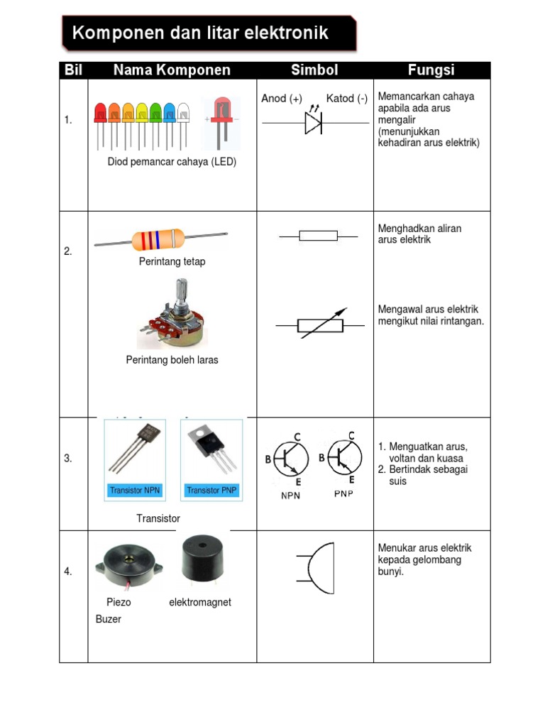 Komponen-komponen elektronik boleh dikelaskan sebagai komponen pasif dan komponen aktif. Report an issue. A Namakan komponen elektronik yang digunakan untuk meratakan arus output litar rektifikasi gelombang penuh.